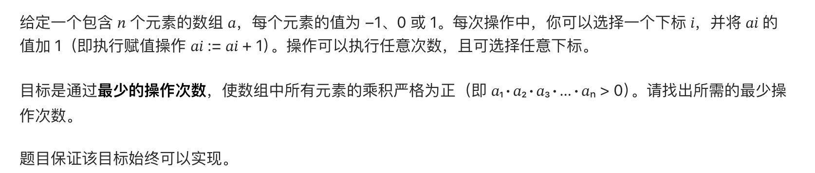 输出一个整数 —— 使数组元素乘积严格为正所需的最少操作次数。