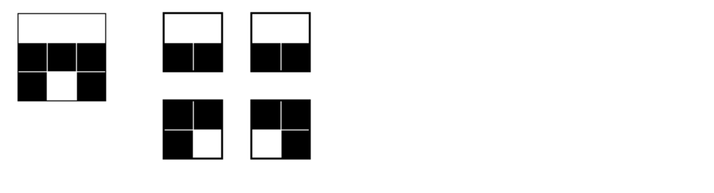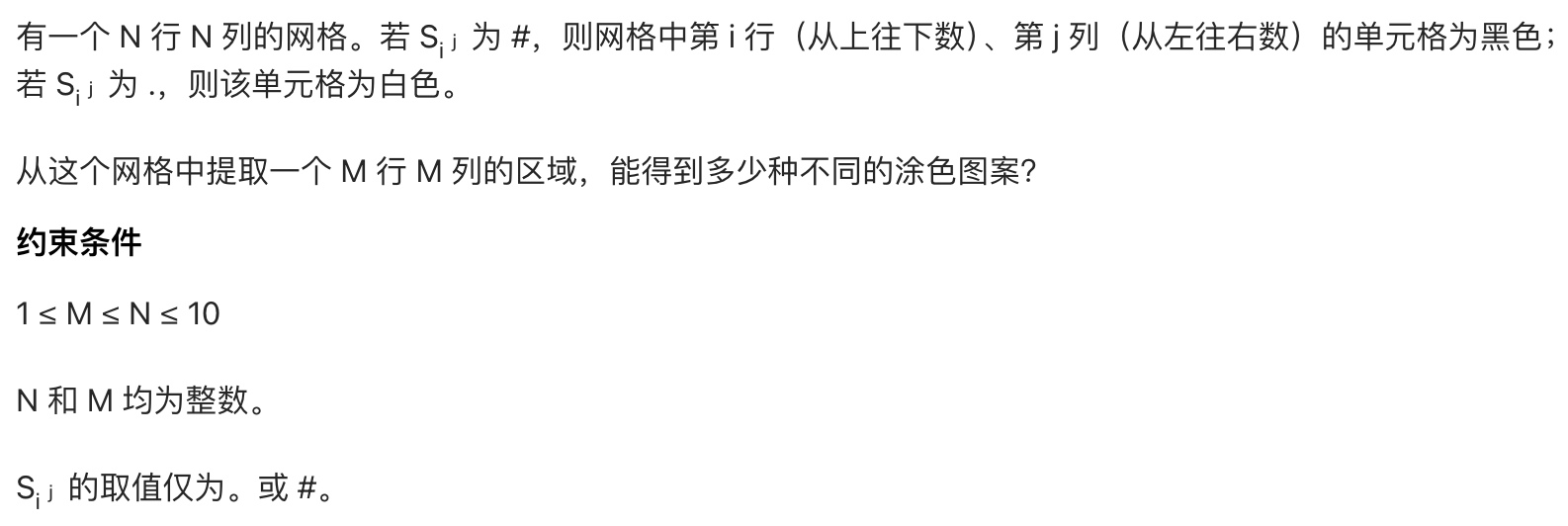 给定网格的状态如下图左所示。从该网格中提取 2 行 2 列的区域共有四种方式(如下图右所示),最终可得到三种不同的涂色图案。