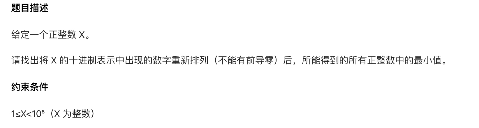 (注意:排列是指原来的数字都得用上, 0不能作为前导0,但数字本身得使用,例如,903排列得到的最小三位数是309,而不是039(有前导0),也不是39(0没有使用)